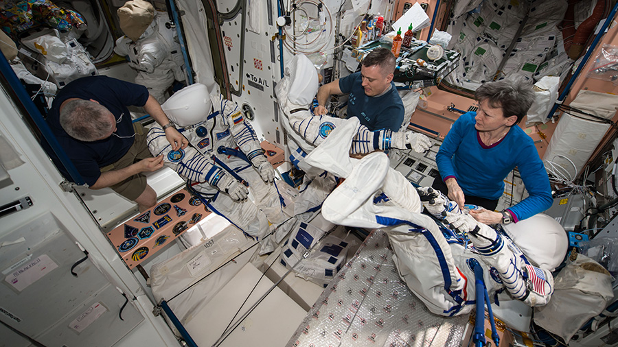 Expedition 52 crew members (from left) Commander Fyodor Yurchikhin and Flight Engineers Jack Fischer and Peggy Whitson prepare the Sokol launch and entry suits they will wear when they undock and land in their Soyuz MS-04 spacecraft.