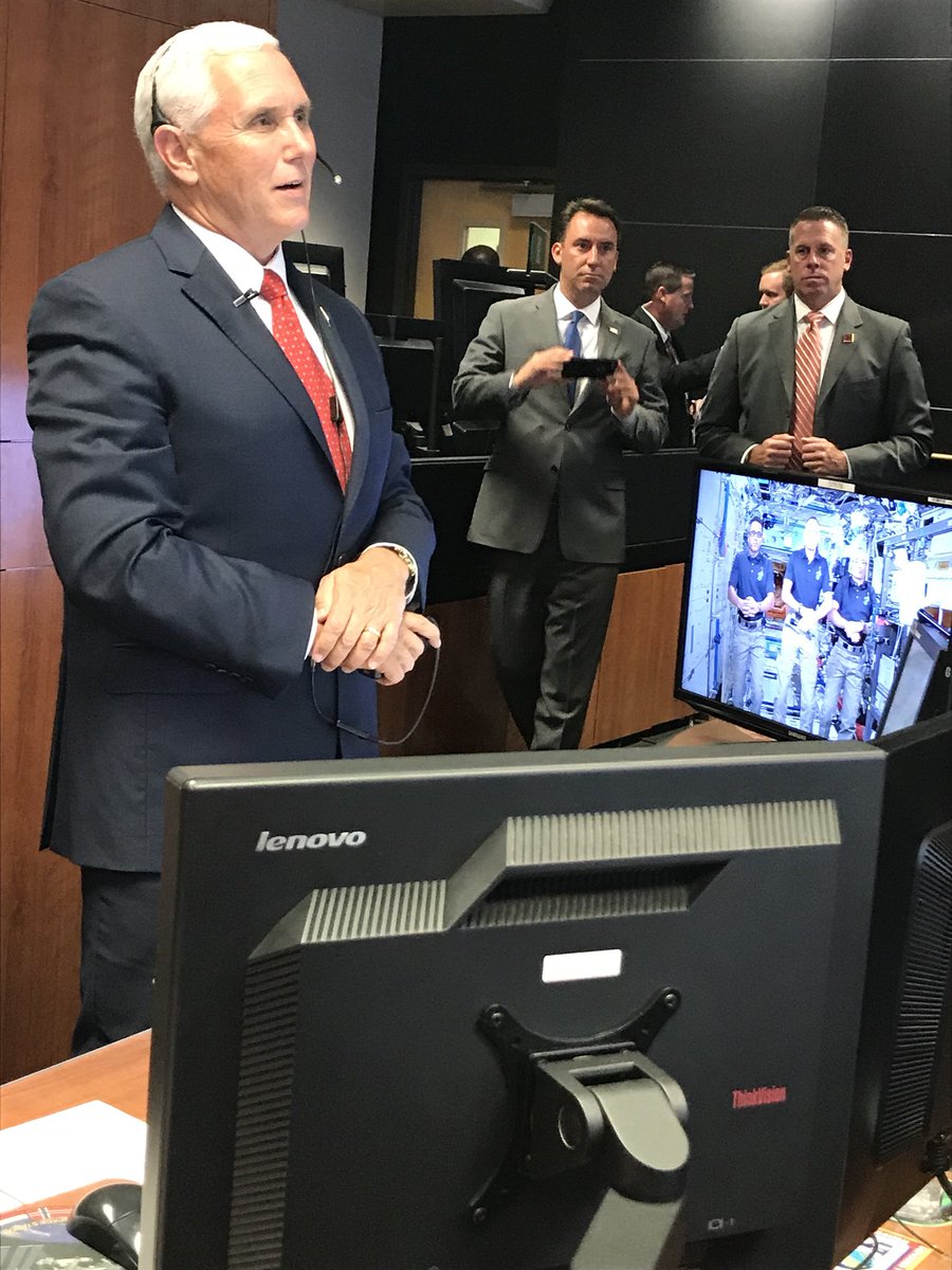 Vice President Mike Pence talked with NASA Astronauts and Expedition 53 crew members Joe Acaba, Randy Bresnik and Mark Vande Hei onboard the International Space Station from the Payload Operations Integration Center (POIC) of the NASA Marshall Space Flight Center, Monday, Sept. 25, 2017 in Huntsville, Alabama. The Vice President visited the space center to view test hardware for NASA's Space Launch System, America's new deep space rocket and to call the crew onboard the International Space Station.