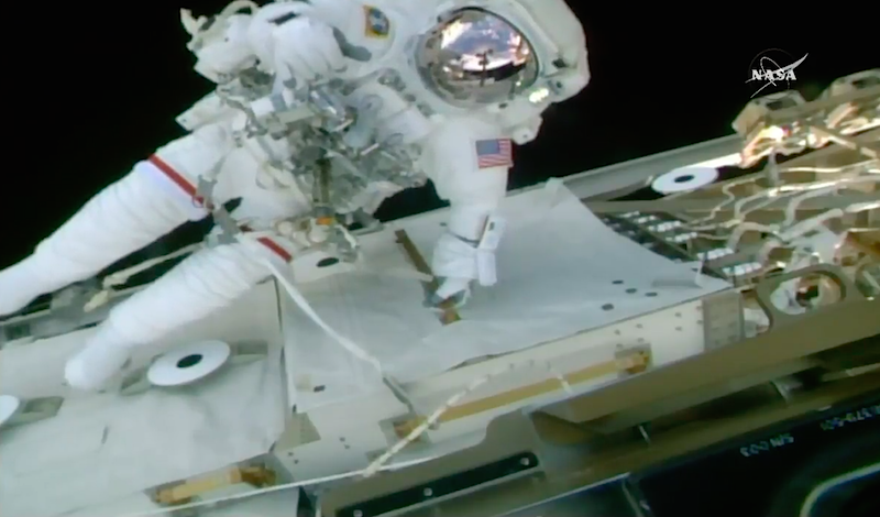 Bresnik and Vande Hei officially started U.S. EVA-45 at 11:56 UTC on Tuesday after the usual multi-hour process of getting into their Extravehicular Mobility Units, pre-breathing pure oxygen to purge nitrogen fr om their blood and depressurizing the airlock in methodical fashion to permit final leak checks on the suits. Heading out the door at orbital sunrise, the two spacewalkers went through the usual verifications of tethers and suit systems before entering the EVA task list – unlike last week's walk that revolved around a single task, Tuesday's EVA had a multi-point list in store for the crew.