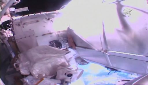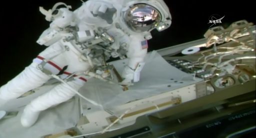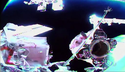 While Vande Hei was dealing with the lengthy lubrication task, Randy Bresnik swiftly proceeded through his tasks, bundling up a protective cover and removing a WIF Socket from the POA LEE (formerly LEE-A). He then dropped off his foot restraint at External Stowage Platform 2, placed an ORU bag inside the airlock and translated around Node 1 and to the Node 3 endcone for his final primary task.