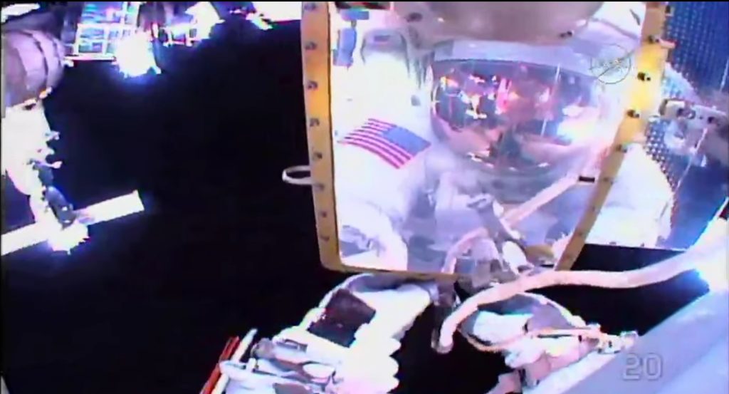 Astronaut Randy Bresnik viewed through a newly installed camera group during Tuesday's EVA – Photo: NASA TV
