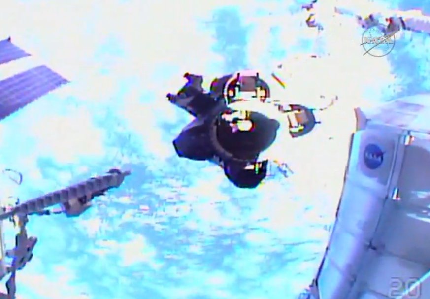 Last Thursday, the spacewalkers replaced the grapple fitting on one end of the Canadarm 2 space crane. Today, Vande Hei used a grease gun to lubricate the internal ball-joint screw mechanism in the replacement fitting, which is used to lock the arm onto visiting spacecraft and other components.