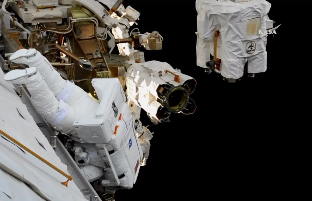 Meanwhile, Mark Vande Hei moved to familiar ground at the P1 truss wh ere most work took place last Thursday. He installed a Worksite Interface Socket on the new LEE-A of the robotic arm that enables it to host foot restraints needed by astronauts when taking a ride on the tip of the 18-meter long Canadarm2. Once the foot restraint was in place, EV-1 and EV-2 joined forces at ESP-1 since the PFCS rotation was a two-man job.