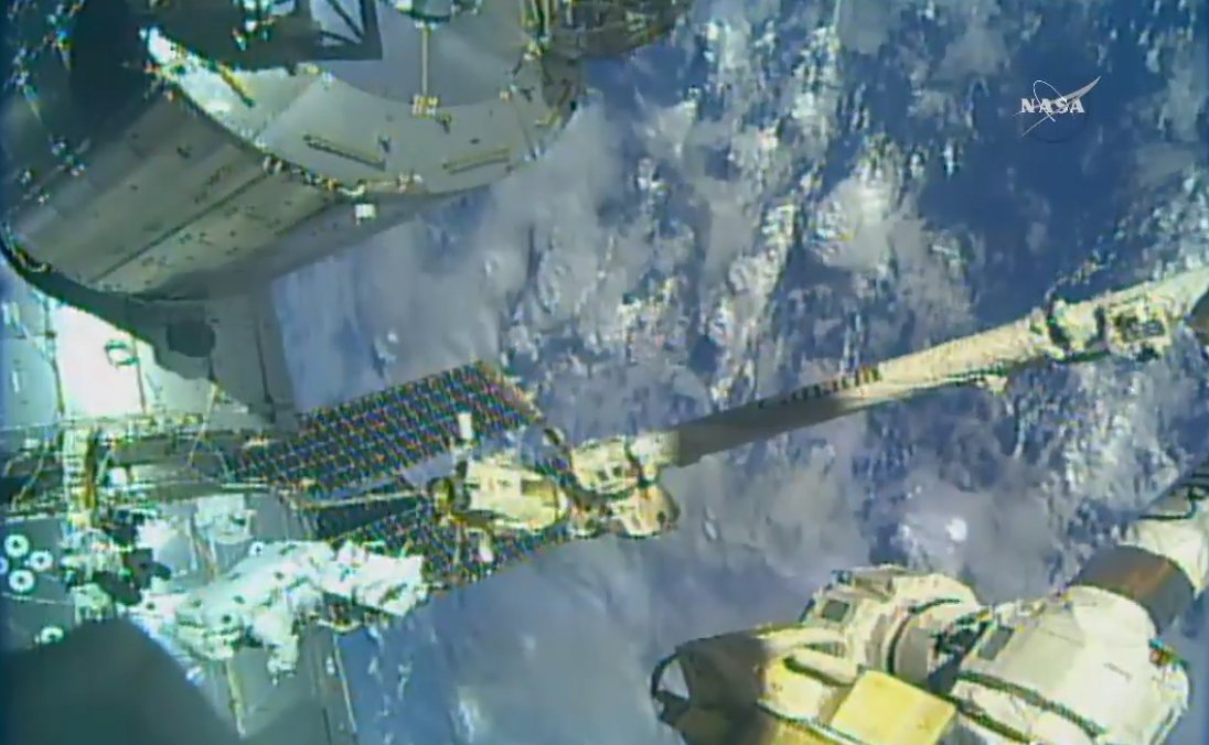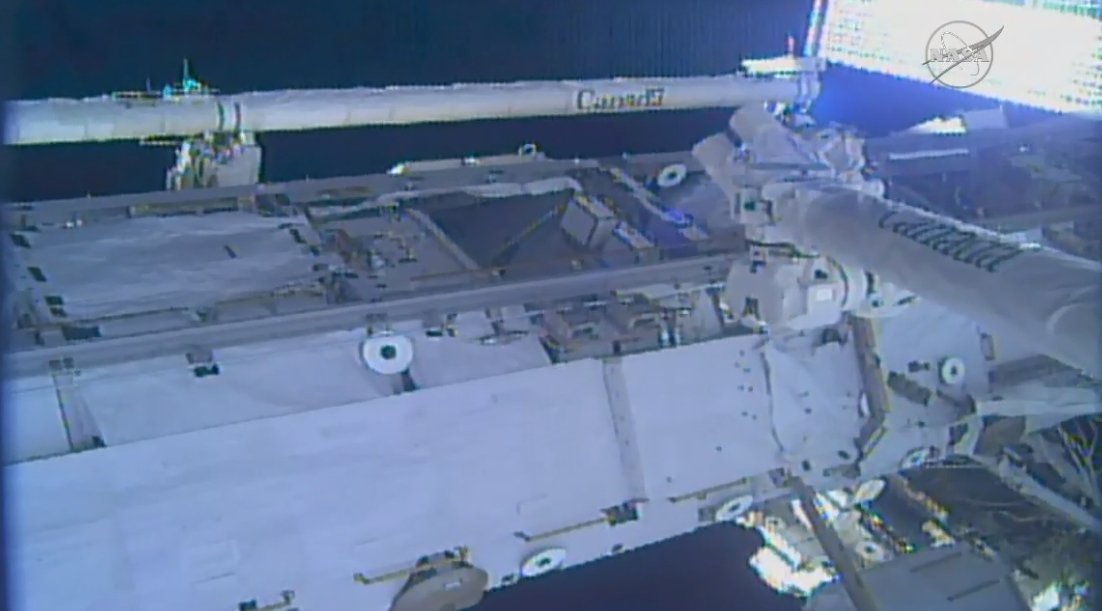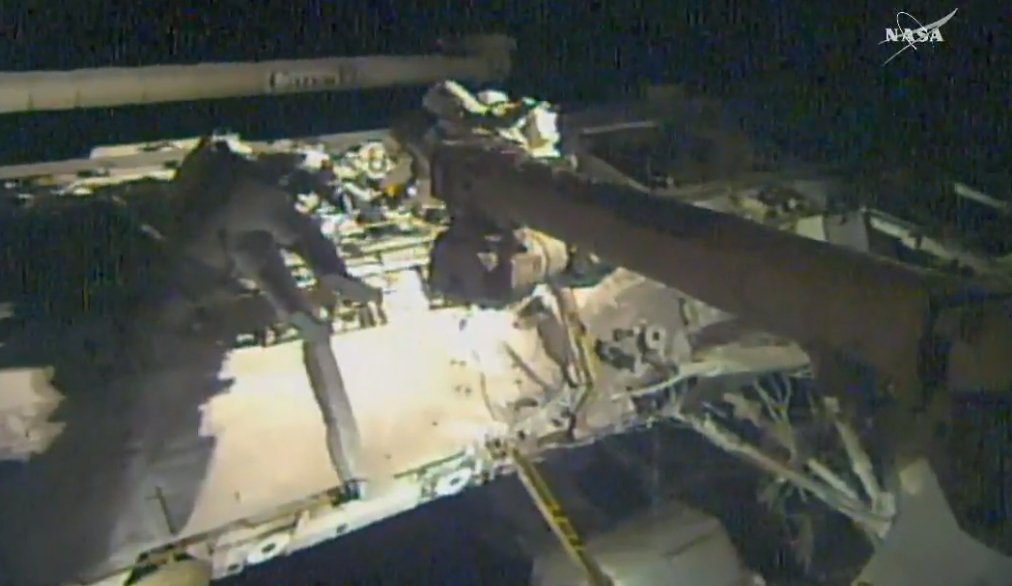 External cam view now live. "Today's EVA is brought to you by Canada." SSRMS - with the replaced LEE on the end. And the former Shuttle OBSS! A robotic rock star of Shuttle's successful RTF safety enhancements.