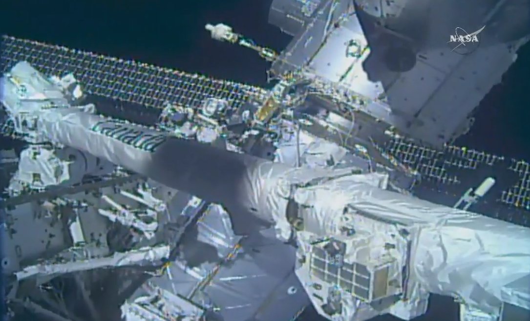 Two NASA astronauts switched their spacesuits to battery power this morning at 7:47 a.m. EDT aboard the International Space Station to begin a spacewalk planned to last about 6.5 hours. Live coverage is available on NASA Television and the agency's website.