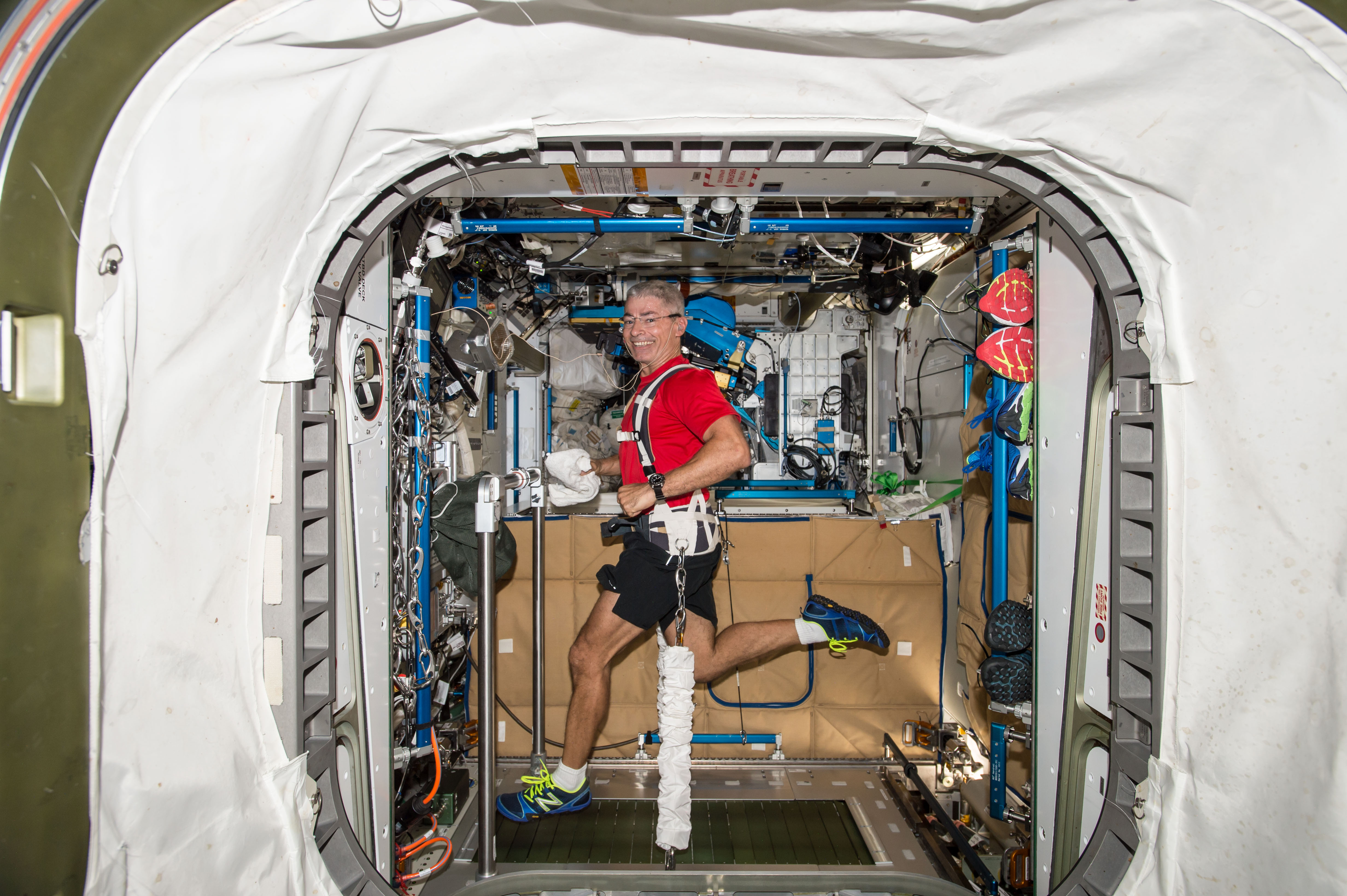 View of Mark Vande Hei, Expedition 53 flight engineer, exercising on the Combined Operational Load Bearing External Resistance Treadmill (COLBERT) T2 aboard the space station. Image Credit: NASA