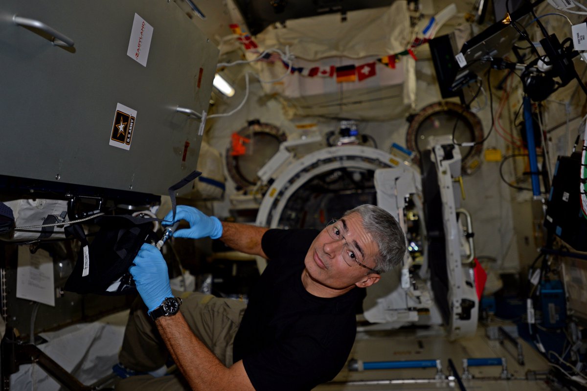 NASA astronaut Joe Acaba worked on a U.S. spacesuit's water system before changing out a hard drive and installing new software on a support laptop for the Alpha Magnetic Spectrometer cosmic ray detector. Commander Randy Bresnik replaced faulty electronics gear inside the Harmony module restoring power to an internal audio speaker unit.