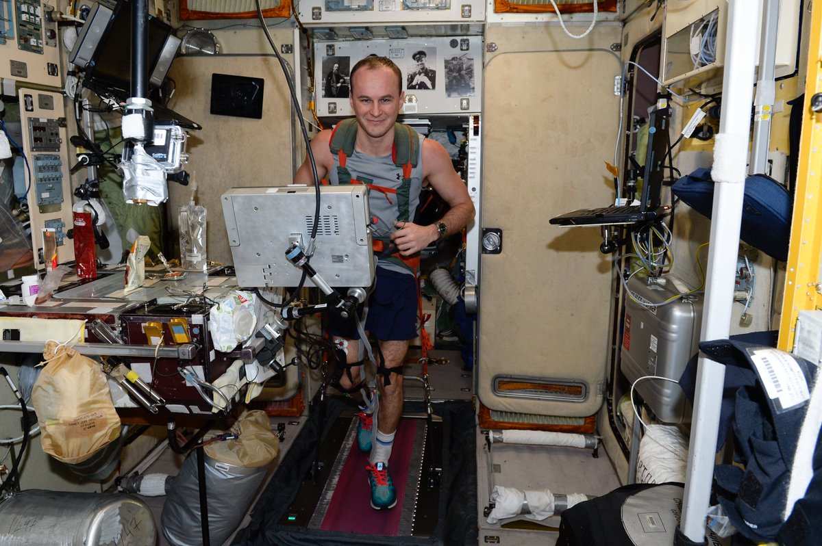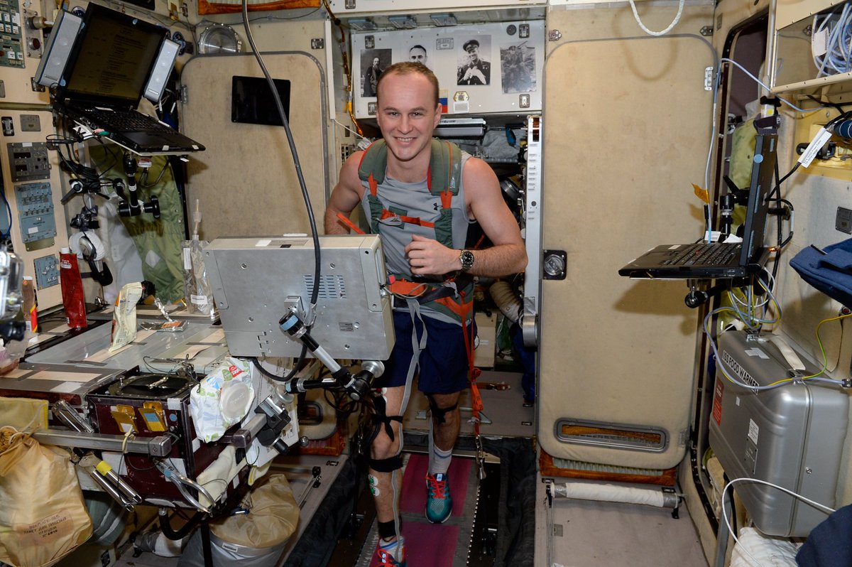 В ходе полета приходится постоянно заниматься спортом, каждый день минимум по 2 часа. Это и беговая дорожка, и велосипед, и вело руками и силовая тренировка на специальном тренажере ARED. На фото исследование состояния мышц и общей выносливости, эксперимент "Мотокард"