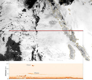 CATS observed part of a plume streaming on July 11, 2015 fr om the Raung Volcano on the Indonesian island of Java. The top image was taken by the Visible Infrared Imaging Radiometer Suite (VIIRS) on the Suomi NPP satellite. The red line shows wh ere, less than an hour after Suomi NPP passed over, CATS scanned a vertical slice through the atmosphere (bottom image). CATS observed this plume after dark, even though other spaceborne instruments did not detect the plume at nighttime.
