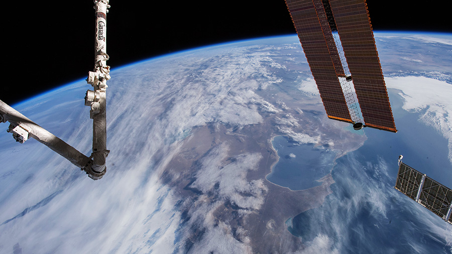 The Caspian Sea is pictured below the International Space Station as it orbited 253 miles above Earth's surface. The station's robotic arm (left) and solar arrays (right) are seen in the foreground.