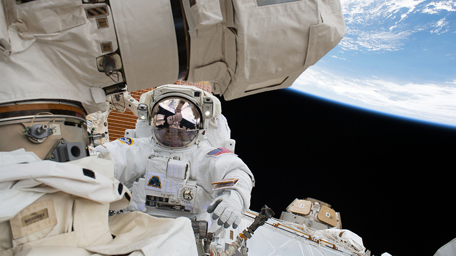 NASA astronaut Mark Vande Hei is pictured during a spacewalk that took place Jan. 23, 2018, to begin maintenance work on the Canadarm2 robotic arm.
