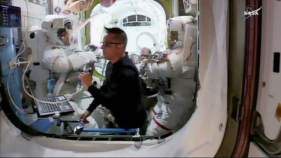 Expedition 54 Flight Engineers Mark Vande Hei of NASA and Norishige Kanai of the Japan Aerospace Exploration Agency are preparing for their exit from the International Space Station's Quest airlock at approximately 7:10 a.m. EST to begin a planned six-and-a-half-hour spacewalk.
