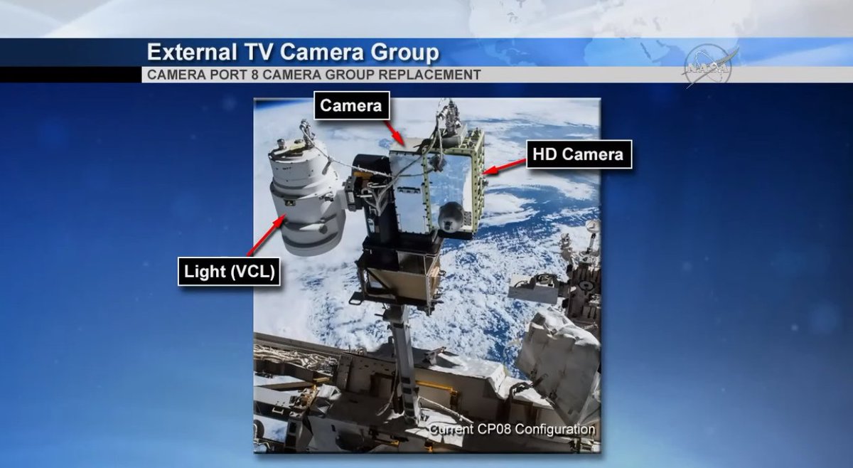 Given the limited time left for EVA-49, Mission Control is changing the ETVCG (External TV Camera Group) replacement task. The spacewalkers will remove the entire CP8 camera as it is and replace it with the spare CLPA, not transitioning the HD cam between the two.