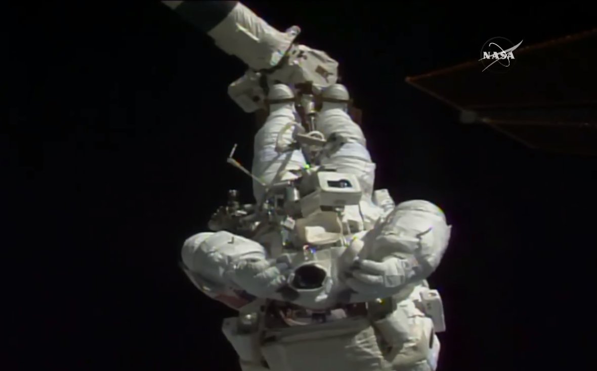 Both spacewalkers now back at the airlock after managing to complete all primary tasks plus one get-ahead. Getting ready to close out the EVA. #spacewalk http://spaceflight101.com/iss/live-spacewalk-coverage/ ...