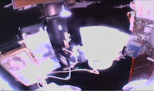 The removed camera group was handed over to Drew Feustel who then provided Arnold with the spare he had picked up from the airlock. Installation of the CLPA was the reverse process for Arnold – placing it in the magnetic soft-dock and driving the secondary and primary bolts, automatically connecting power/data interfaces in the back of the camera assembly.