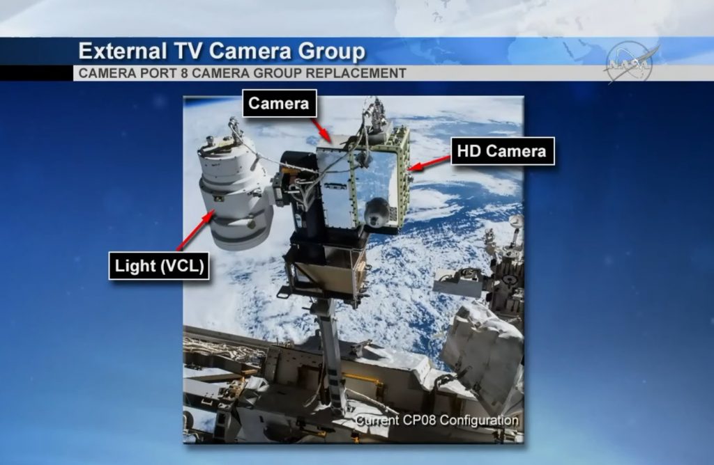 Exercising caution since the PET+5:50 mark was considered a hard cutoff, Mission Control revised the CP8 camera replacement task – foregoing the transfer of the HD Camera assembly between the failed Camera, Light, Pan/Tilt Assembly (CLPA) and the spare. Instead, Ricky Arnold removed the camera group as a whole by releasing two secondary and one primary structural bolt followed by sliding the assembly out of its soft-dock.