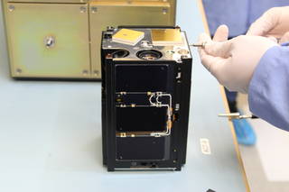 The Integrated Solar and Reflectarray Antenna (ISARA) spacecraft undergoing pre-launch integration.