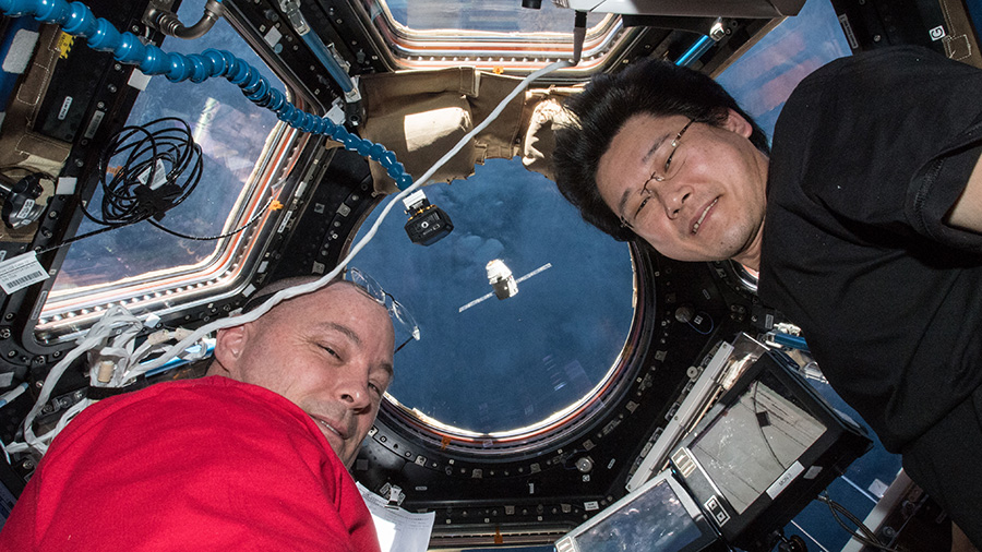 Astronauts Scott Tingle (left) and Norishige Kanai watch the SpaceX Dragon cargo craft arrive moments before capturing it with the Canadarm2 robotic arm.