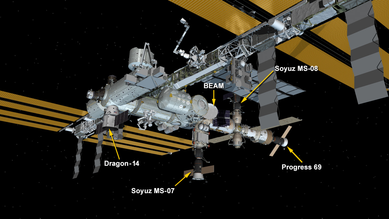 Four spaceships are docked at the space station including the SpaceX Dragon space freighter, the Progress 69 resupply ship and the Soyuz MS-07 and MS-08 crew ships.