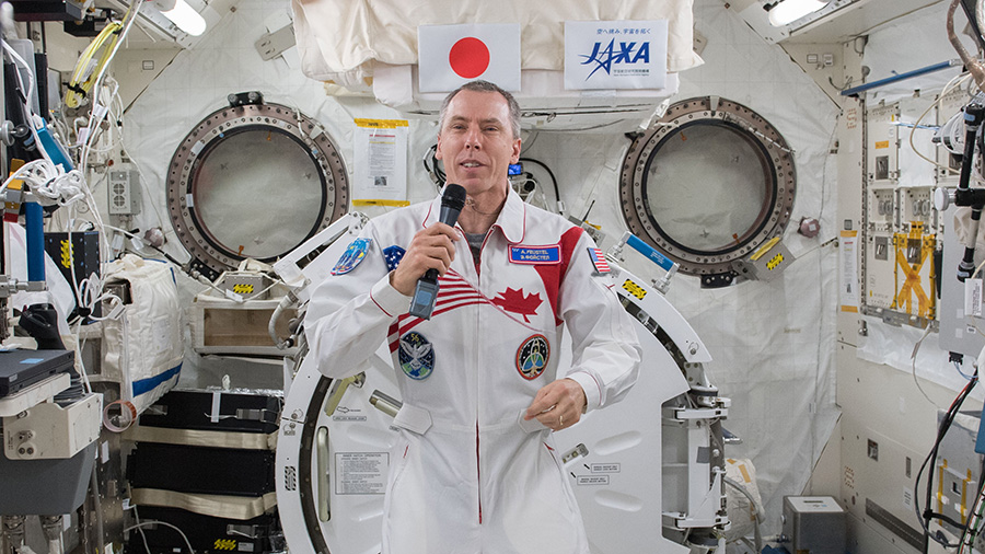 Expedition 55 Flight Engineer Drew Feustel of NASA is inside the Japanese Kibo laboratory module talking to dignitaries on Earth, including university officials, musicians and scientists, during an educational event that took place at Queen's University in Kingston, Ontario.