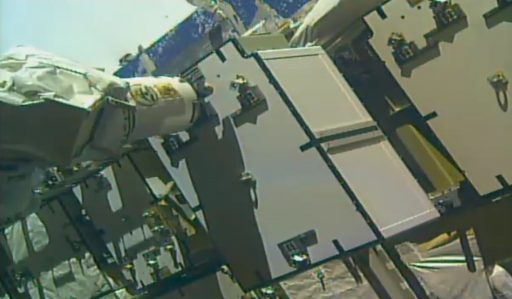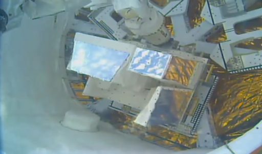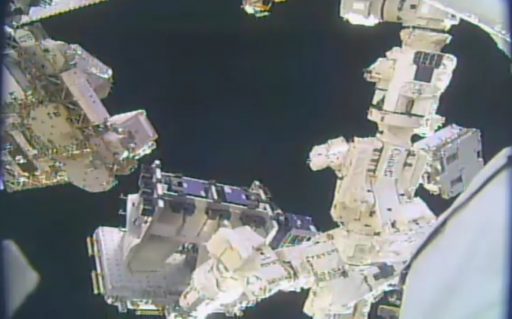 With MISSE-FF 1 finding in its new home, robotic ops resumed on Tuesday when the Mobile Transporter moved all the way port to Worksite 8. Working overnight and into Wednesday, Dextre detached the Pump Flow Control Subassembly (PFCS) from its Flight Support Equipment (FSE) and installed onto the P6 Long Spacer after removal of a degraded PFCS unit that is to be disposed.