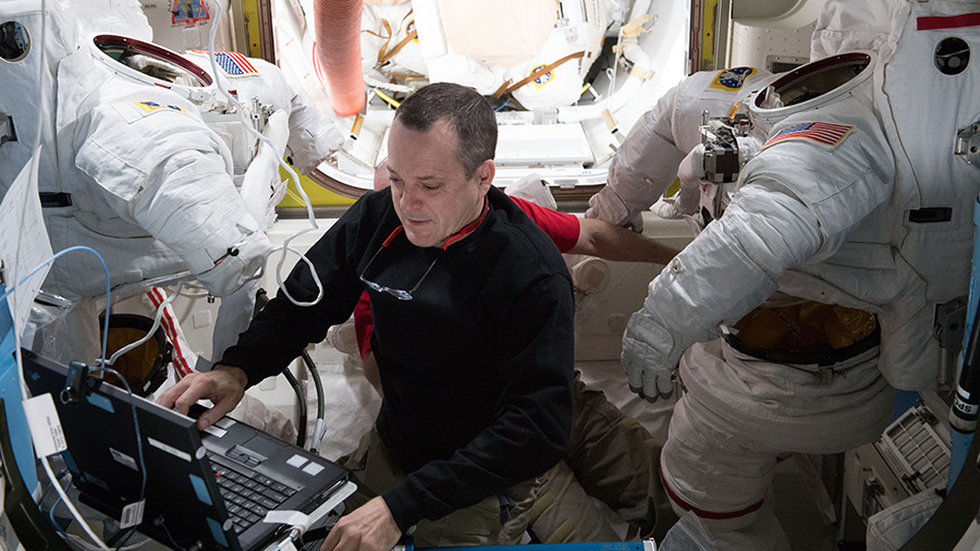 Two NASA astronauts are looking ahead to their next spacewalk scheduled for May 16. Veteran spacewalkers Ricky Arnold and Drew Feustel took their body measurements today to ensure a proper fit inside their U.S. spacesuits. The duo will work outside the orbital lab for about 6.5 hours to swap out thermal control gear that circulates ammonia to keep station systems cool.