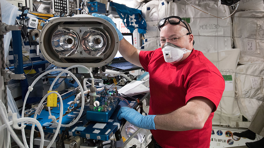 Astronaut Ricky Arnold completes the scrubbing of water cooling loops inside a pair of U.S. spacesuits after the completion of spacewalk on March 29, 2018.