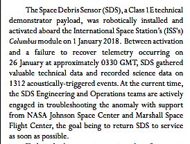 Space Debris Sensor for @NASA, installed on #ISS Jan. 1 to measure impacts, failed on Jan 26 and is still down. Work continues to bring it back to service, NASA says. Designed to operate on ISS exterior for 2-3 yrs.