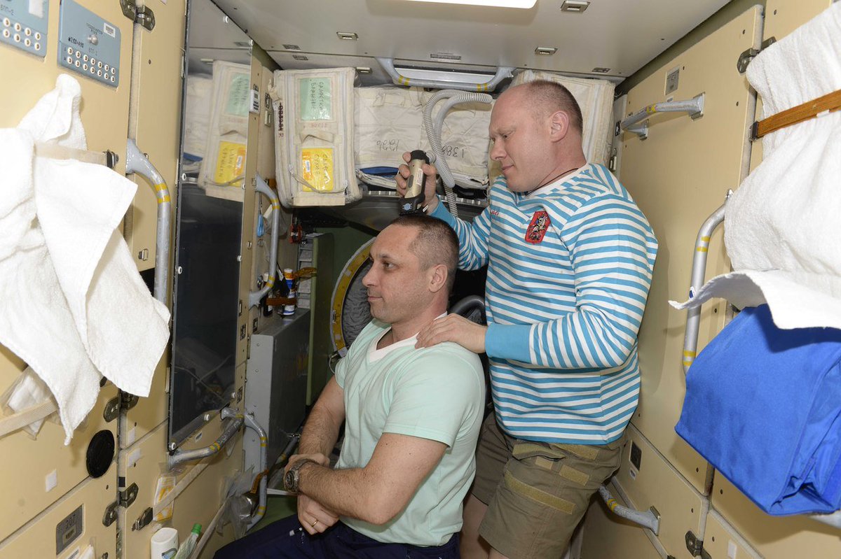 Я обещал вам показать, как выглядит «космическая парикмахерская». Мы используем обычную машинку для стрижки, но обязательно присоединяем ее к шлангу от пылесоса. Это необходимо, чтобы отстриженные волосы не попадали в глаза и дыхательные пути.