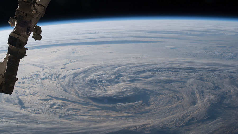 A portion of the Canadarm2 robotic arm (left) and stormy clouds are seen in the north Pacific Ocean as the International Space Station orbited off the eastern coast of Russia.