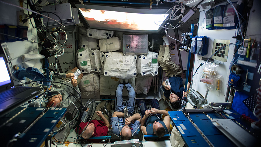 At 22:00, after initial "safing" and unpacking of Soyuz, we finally retired to our quarters. It was very hard to sleep, and I think the busy days leading us to the International Space Station (ISS) were beginning to take their toll. We were scheduled for a full day of work to include familiarization of safety equipment as well as beginning to prepare several science experiments for action. The SpaceX Dragon cargo craft arrived to ISS a couple days before we did, and its cargo included several experiments that needed to be conducted promptly upon arrival. I was doing a great job of floating fr om one module to another. Since I was a little behind schedule due to having to learn wh ere everything is, I decided I could speed up my floating to be more expeditious. Well, we know how that usually goes and this time was no exception. I gathered a "bag of knots" (aviator slang for "going really fast") and began a healthy transition from Node 2 into the Columbus module – wh ere I predictably hit the top of my head. Ouch. The following three days (Tuesday-Saturday) were challenging as we worked to integrate all of our new knowledge and increase our efficiencies. The senior crew was very helpful and understanding. I was very grateful of how they managed our arrival and how they slowly passed down the information we needed to get started. Everything was different from life on Earth. Everything. We quickly figured out that we needed to think differently as we began to adapt to life in space. Drinking water, preparing food, eating food, using the toilet, working, physical training, etc., all different. I had a good handle on the differences and what to expect before I got there. But I didn't expect that when operations got very busy that my reflexes would respond naturally as they did on Earth. The light bulb came on. I was going to have to move slower and think about everything before I took action. This is why space fliers new to this environment appear to be less efficient than most managers and/or operations planners would like. Adaptation to life in space takes time, and you can't rush it.
