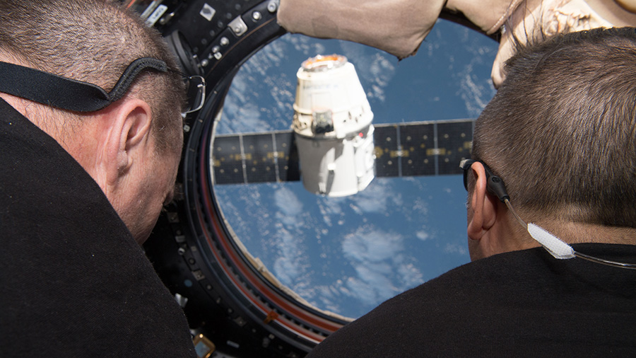 Flight Engineers Scott Tingle and Joe Acaba monitor the departure of the SpaceX Dragon Commercial Resupply Services-13 (CRS-13) spacecraft through windows in the Cupola module.