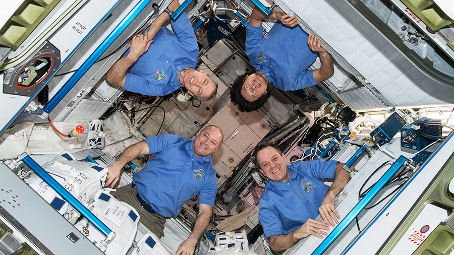 The four astronauts who comprise the six-member Expedition 55 crew pose for a portrait inside the International Space Station. They are (clockwise from bottom right) NASA astronauts Ricky Arnold, Scott Tingle and Drew Feustel and Japan Aerospace Exploration Agency astronaut Norishige Kanai.