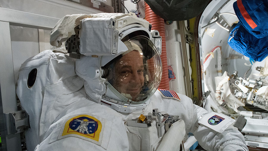 NASA astronaut Ricky Arnold is pictured inside a U.S. spacesuit for a fit check verification ahead of a pair of spacewalks.
