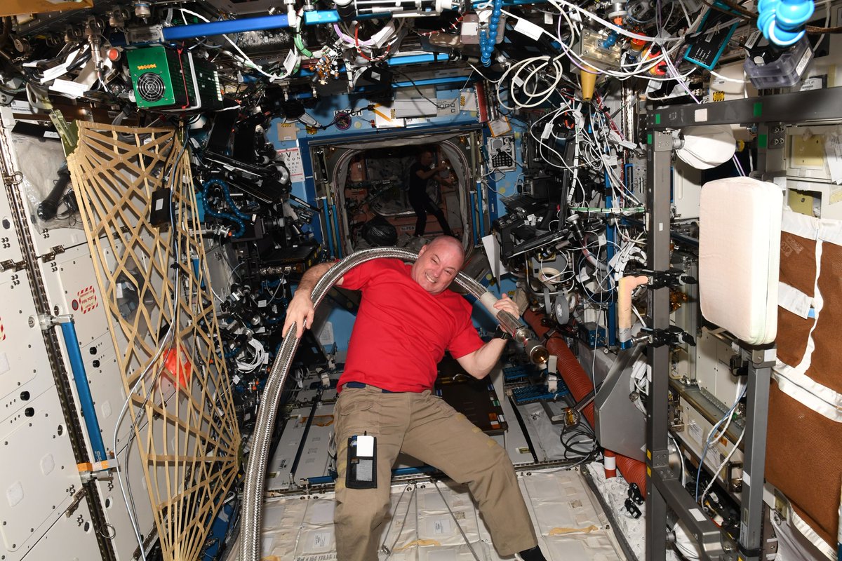 Astronauts Feustel and Arnold are in their spacesuits (3006 and 3003) in the Quest airlock preparing for spacewalk ISS US EVA-50. The airlock has now been depressurized to 35 mbar