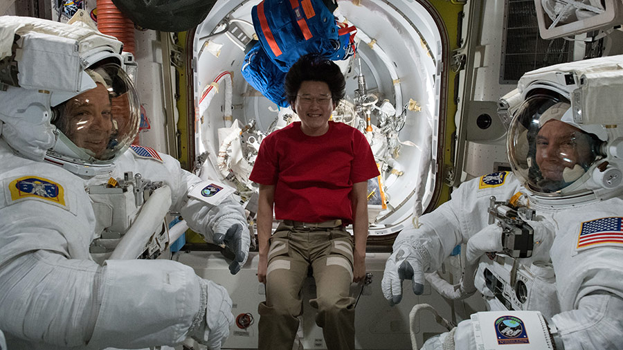 NASA astronauts Ricky Arnold (left) and Drew Feustel are pictured inside their U.S. spacesuits for a fit check verification ahead of a pair of spacewalks. Norishige Kanai (center), from the Japan Aerospace Exploration Agency, assisted the duo in and out of the spacesuits during the sizing process.