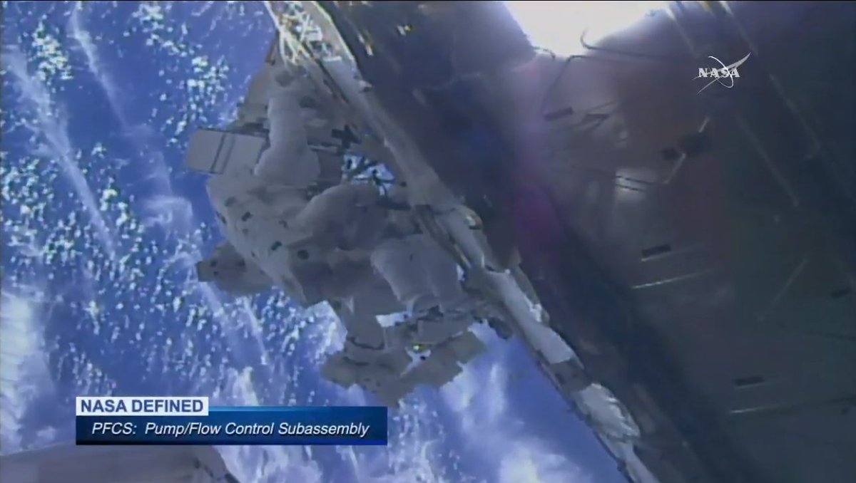 "The purpose of a PFCS, a pump flow control sub-assembly, is all about the cooling of the batteries the space station holds its electrical power in," said Anthony Vareha, the spacewalk flight director at the Johnson Space Center in Houston.