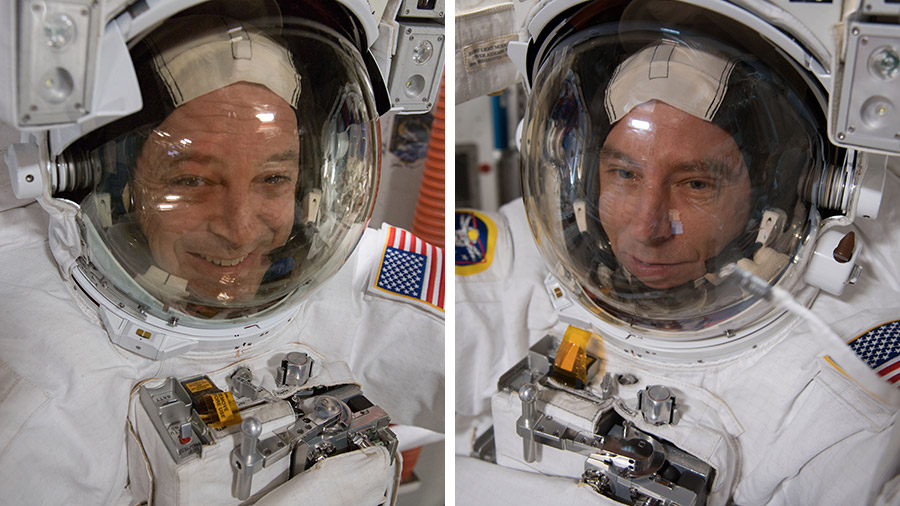 NASA astronauts Ricky Arnold and Drew Feustel are suited up inside U.S. spacesuits for a fit check verification ahead of a spacewalk that took place May 16, 2016.