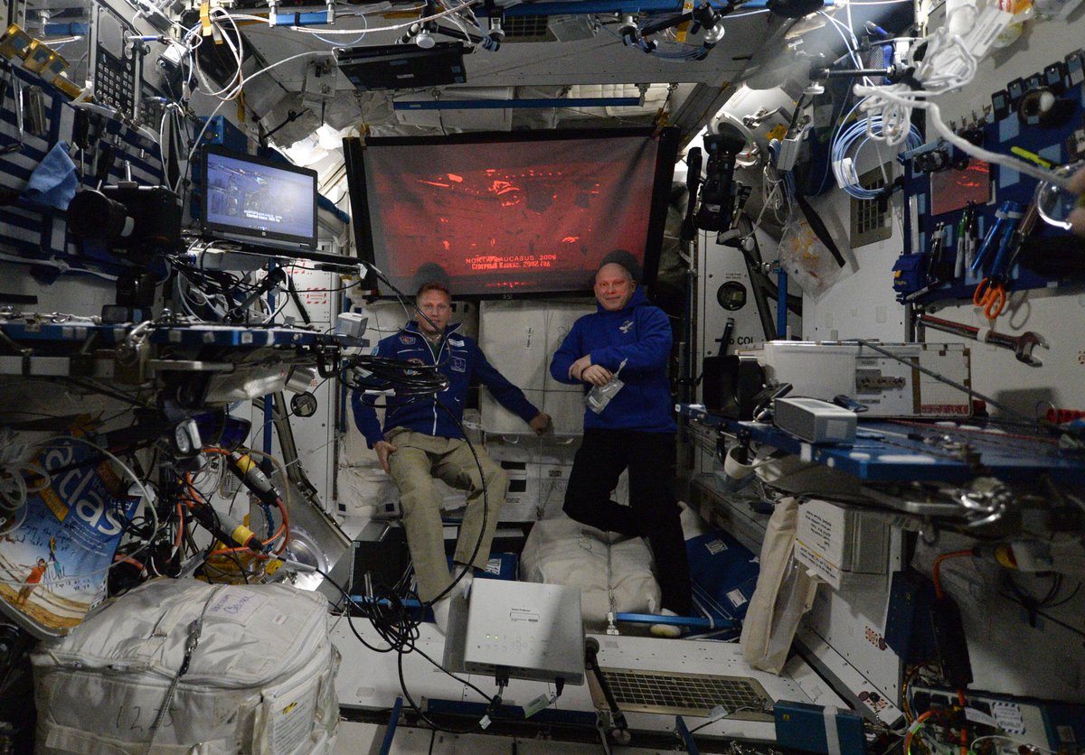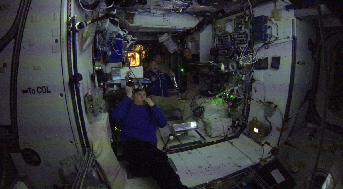 Один из традиционных вечерних кинопросмотров. На этот раз всем экипажем смотрели новый российский фильм "Решение о ликвидации". Картина всем очень понравилась! . Our traditional @Space_Station movie night. We watched a new Russian film "Decision: Liquidation".