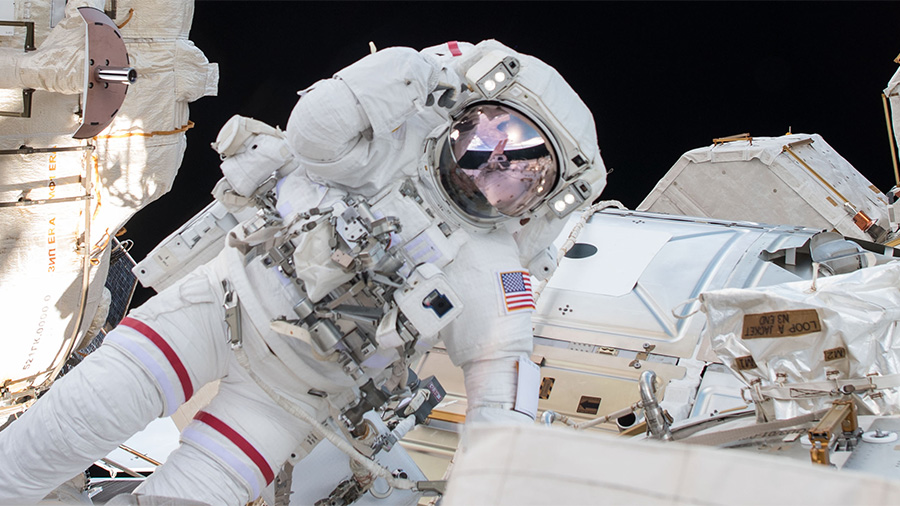 NASA astronaut Drew Feustel seemingly hangs off the International Space Station while conducting a spacewalk with fellow NASA astronaut Ricky Arnold (out of frame) on March 29, 2018. Feustel, as are all spacewalkers, was safely tethered at all times to the space station during the six-hour, ten-minute spacewalk.
