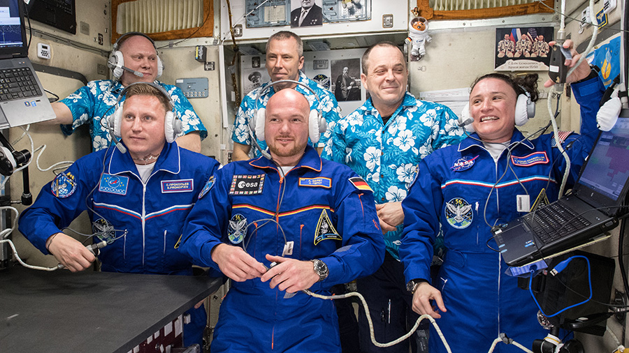 The newly-expanded six-member Expedition 56 crew gathers in the Zvezda service module shortly after three new crew members arrived June 8, 2018. In the front row (from left) are the newest Expedition 56 Flight Engineers Sergey Prokopyev, Alexander Gerst and Serena Auñón-Chancellor. In the back (from left) are Flight Engineer Oleg Artemyev, Commander Drew Feustel and Flight Engineer Ricky Arnold.