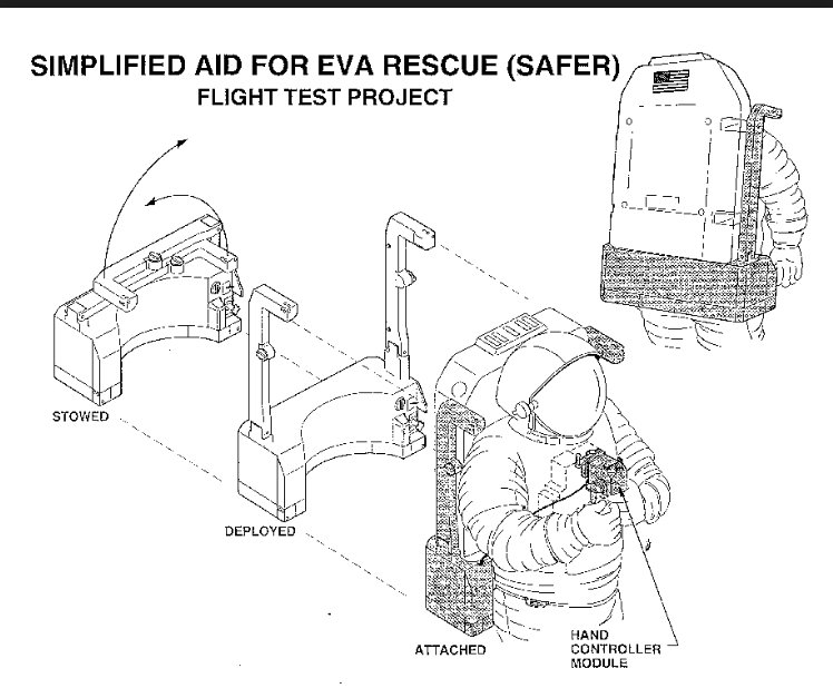 EVA-51: SAFERS installed on to the Spacewalker's EMUs. Their own jet packs. Sounds like fun, but it wouldn't be a fun situation if they ever had to use them. Emergency thrusters in the event of becoming untethered. Last option to save their life.