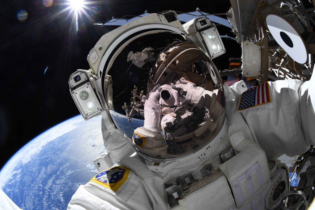 Cosmonaut Oleg Artemyev took this photo of astronaut Drew Feustel on Thursday's spacewalk. Credit: Oleg Artemyev/Roscosmos