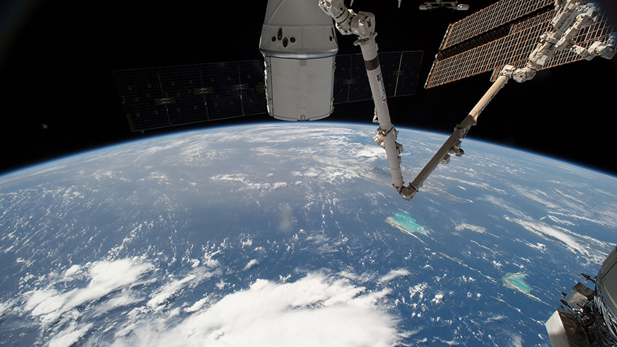 The SpaceX Dragon and the International Space Station orbit above the Bahamas in the Atlantic Ocean.