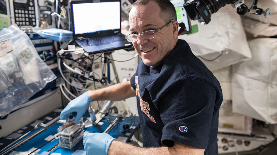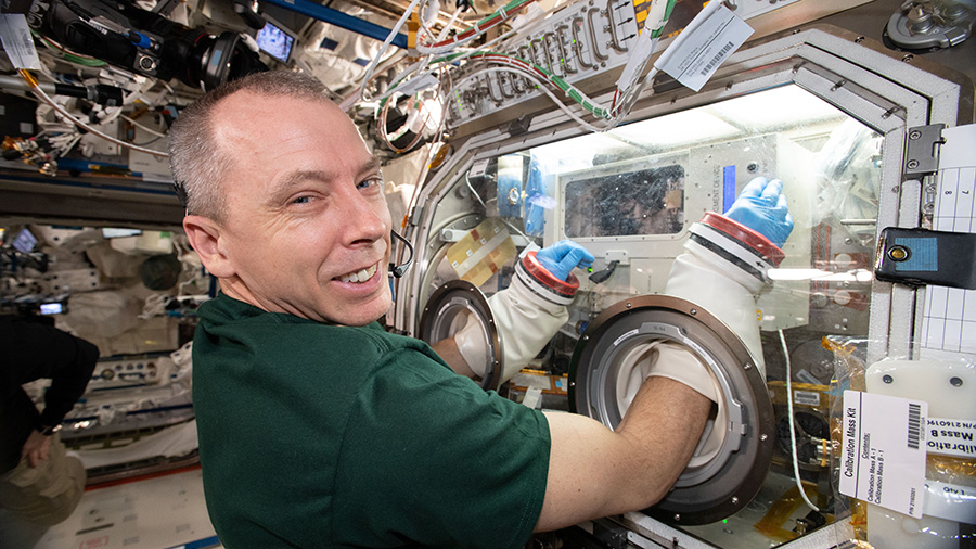 NASA astronaut Drew Feustel works inside the Microgravity Science Glovebox inspecting mice being observed as part of the Rodent Research-7 experiment.