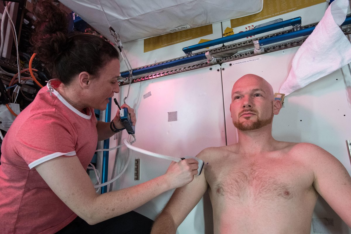 My crew mate @AstroSerena looking into my muscles with an ultrasound probe, as part of the Myotones experiment. Trying to develop a quick way to determine the training & health state of a muscle. My part in this experiment is trying to be completely relaxed... #Horizons