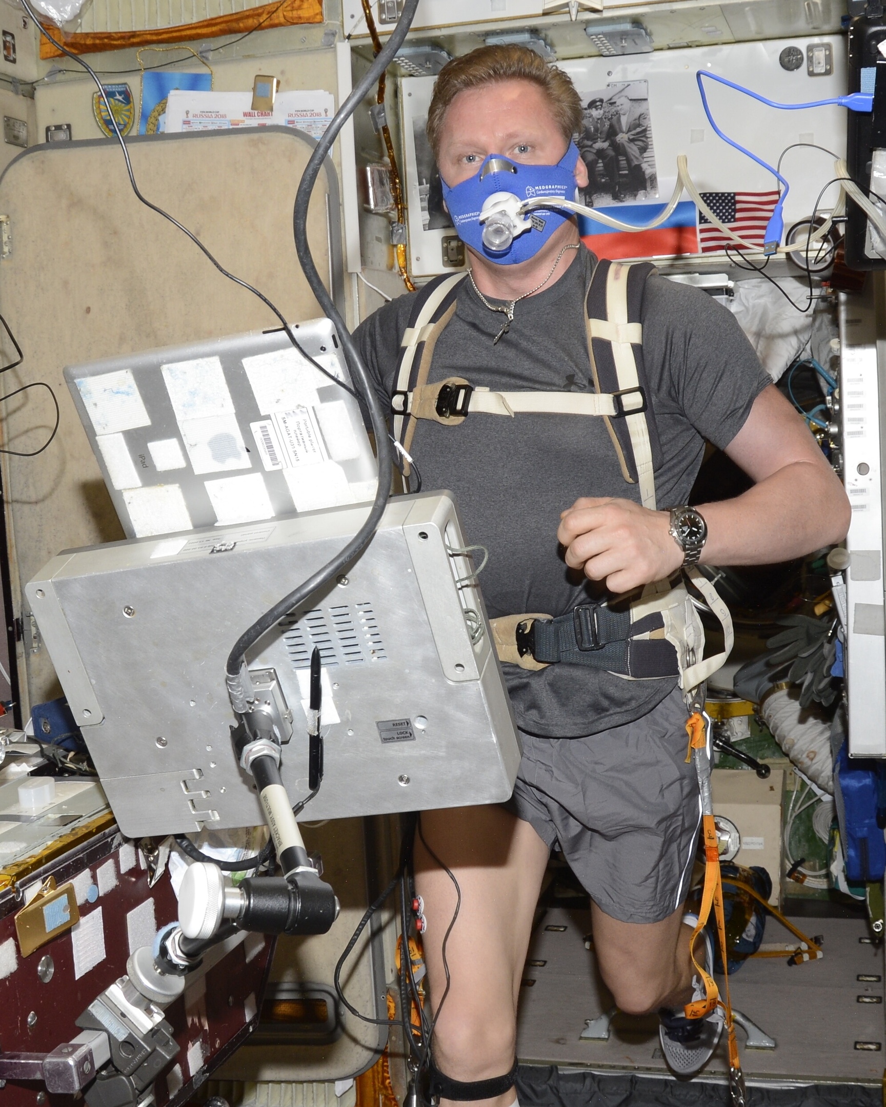 Известно, что бег поднимает настроение! Но не только по этой причине у космонавтов на МКС тренировки на беговой дорожке являются обязательными в рабочем графике. Физические упражнения - основной элемент системы профилактических мероприятий в условиях невесомости. Эффективность режимов физической нагрузки исследуется во время эксперимента "Профилактика-2", в ходе которого космонавт выполняет специальные задания на беговой дорожке. Данные, полученные с газоанализатора, используются для корректировки системы дальнейших тренировок космонавтов на станции.