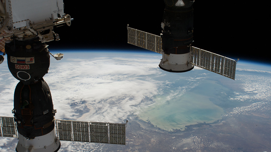 Russia's two docked spacecraft, the Soyuz MS-09 (left) crew ship and the Progress 70 resupply ship, are pictured as the International Space Station orbited nearly 254 miles above northern Kazakhstan.