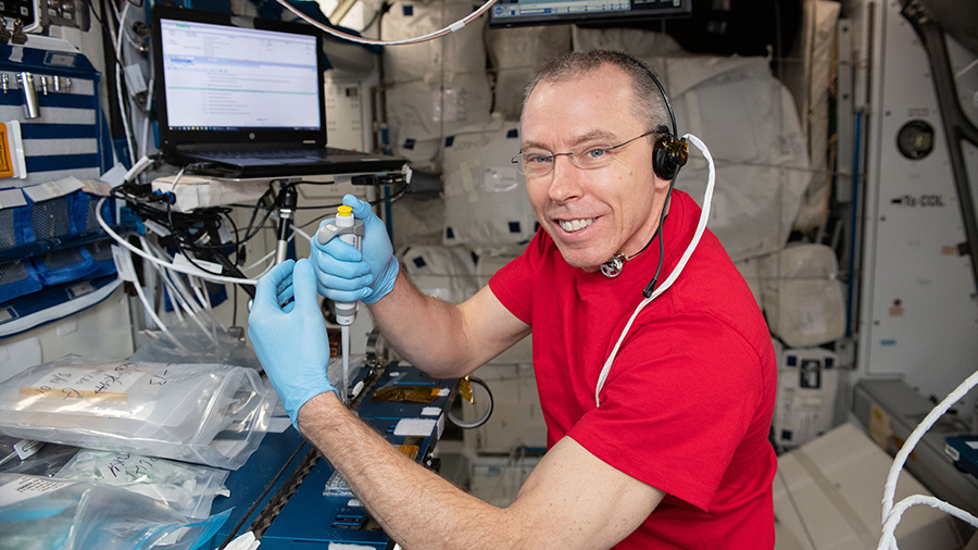 Arnold started his morning extracting RNA to help researchers decipher the changes in gene expression that take place in microgravity. Feustel photographed protein crystal samples with a microscope to help doctors develop more effective disease-treating drugs on Earth.