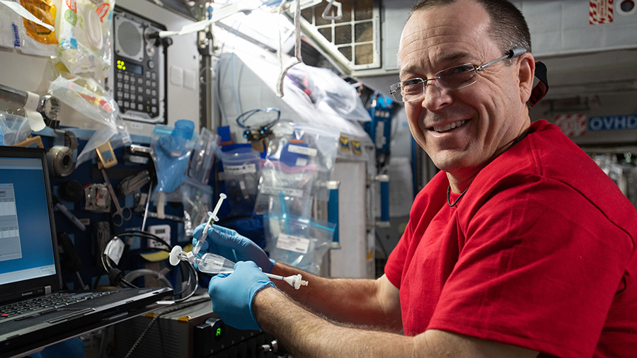NASA astronaut Ricky Arnold works on an experiment that extracts RNA from biological samples to help researchers decipher the changes in gene expression that take place in microgravity.